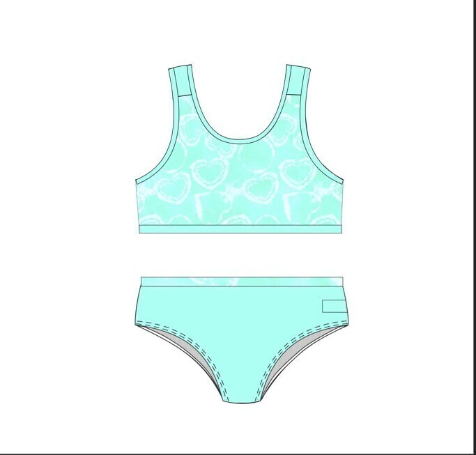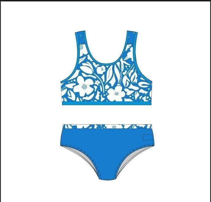 Bikini top estampado con breteles cruzados y bombacha lisa con collareta estampada.