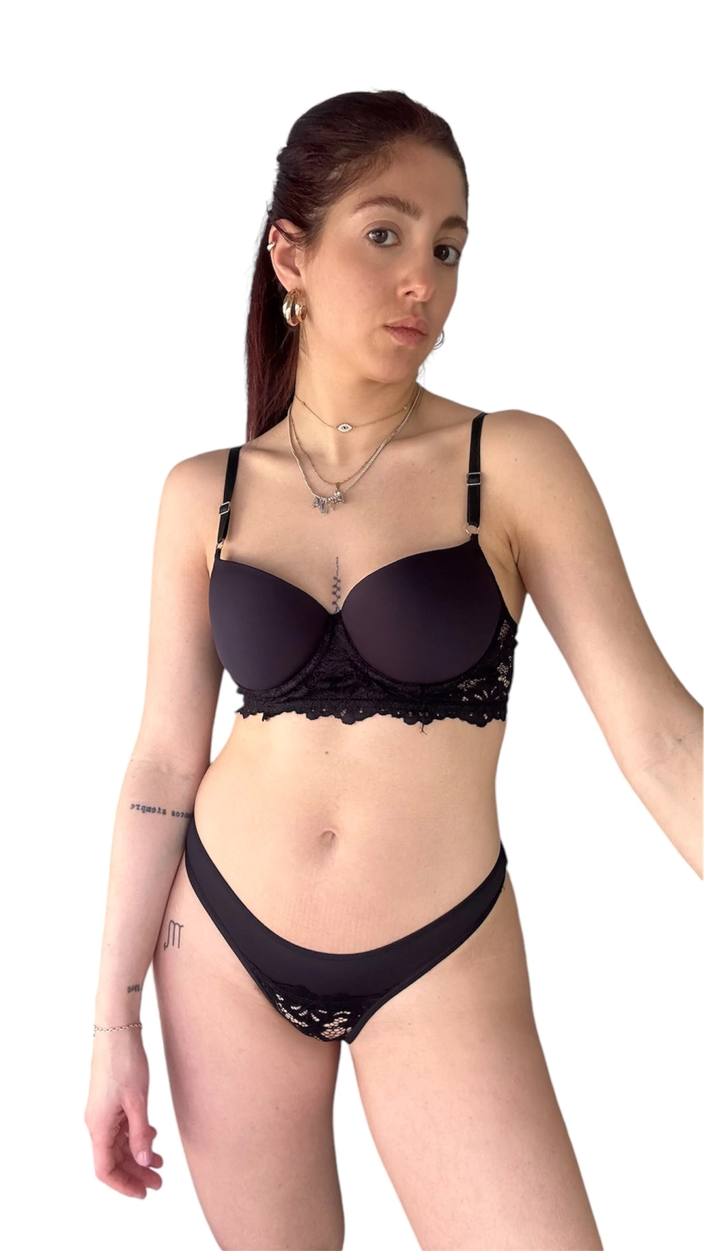 Conjunto corpiño taza soft con base y colaless. El diseño y el encaje puede variar según la partida.